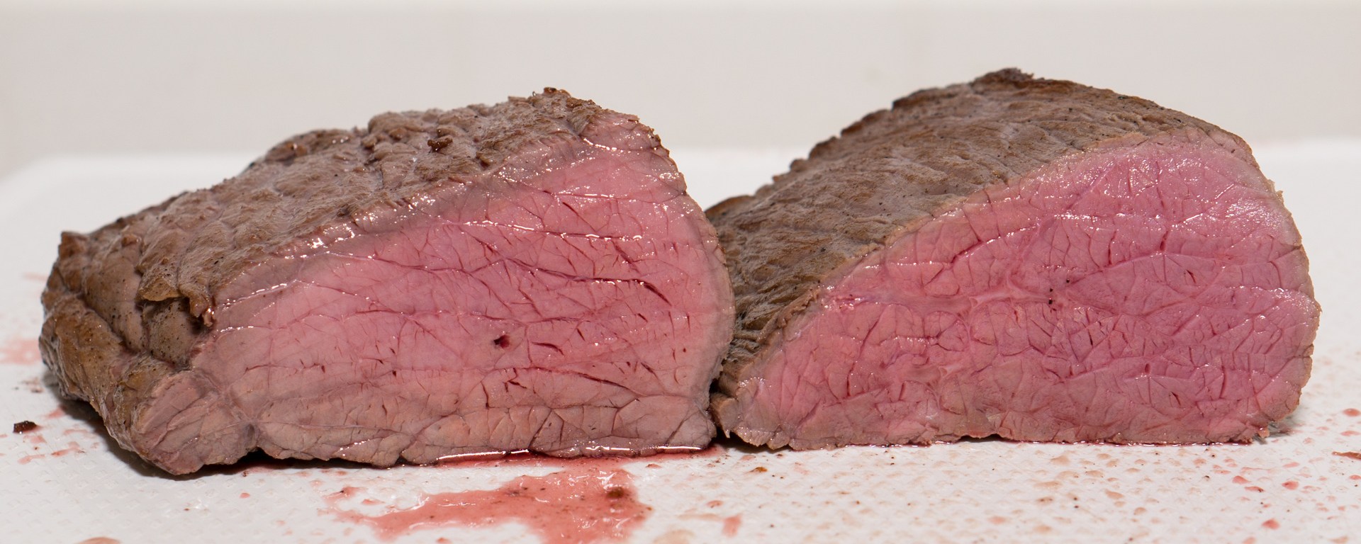 Voor een eerlijke vergelijking heb ik het stuk rosbief in de lengte in tweeën gesneden…