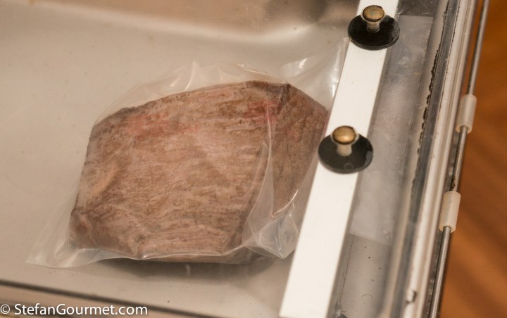 Na een aantal jaren met een sealapparaat te hebben gehannest (waarbij het sealapparaat binnen een jaar de geest had gegeven, en de nieuwe die ik vanuit de garantie kreeg ook binnen een jaar weer stuk was), heb ik een professionele vacuümmachine aangeschaft. Dat is er zo eentje die de slager ook heeft. Hierbij bevindt de gehele zak, dus niet alleen maar de opening, zich in een ‘kamer’ waar de lucht uit wordt gepompt. Na het sealen wordt de lucht weer in de kamer gelaten.