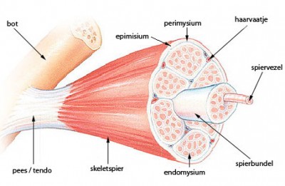 Vlees was het spierweefsel van een dier voordat het vlees werd. Dat spierweefsel werd door het dier gebruikt om te bewegen, te staan, adem te halen, et cetera. Spieren zijn vezels van proteïnen (eiwitten) die op verschillende niveaus zijn gebundeld door een laagje collageen. Individuele spiervezels zijn omhuld door het endomysium. Dit zijn de vezels of ‘draadjes’ die je in het vlees kunt zien. Een bundel spiervezels wordt bij elkaar gehouden door het perimysium, en om de hele spier zit het epimysium. Het epimysium is het witte vlies dat meestal al door de slager is verwijderd. Via een pees zorgt het epimysium voor de verbinding van de spier met het skelet (een bot). Een hoop moeilijke woorden maar eigenlijk is het redelijk eenvoudig: een spier zit ongeveer net zo in elkaar als gewapend beton. De laagjes collageen die om de spiervezels heen zitten (endomysium, perimysium en epimysium) zijn dan het staal en de spiervezels het cement.