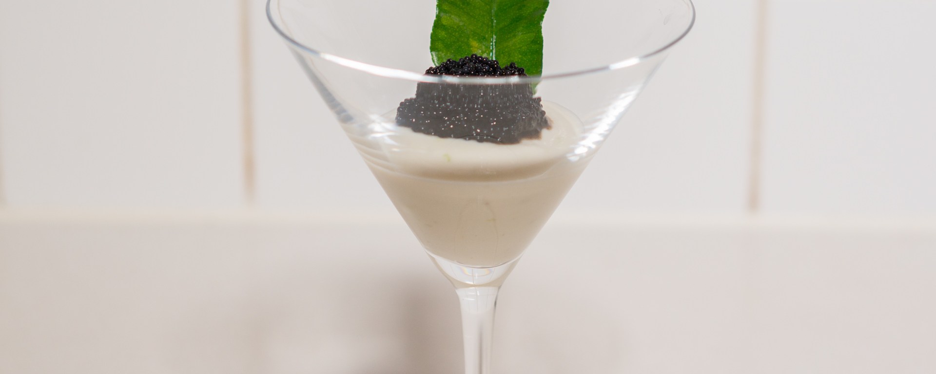 Schep de kaviaar erbovenop, en serveer. Het is het lekkerst om in elke hap zowel bloemkoolmousse als kaviaar te eten.