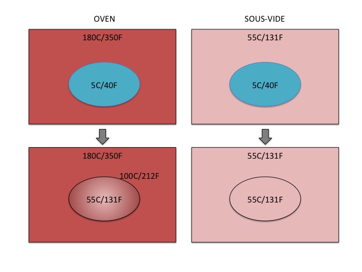 In het plaatje een vergelijking tussen de oven (links) en sous vide (rechts). Het ‘ei’ in het midden is het vlees dat je gaart. beide gevallen begint het stuk vlees op 5 graden (koelkasttemperatuur) en gaan we naar de situatie dat de kern 55 graden heeft bereikt.