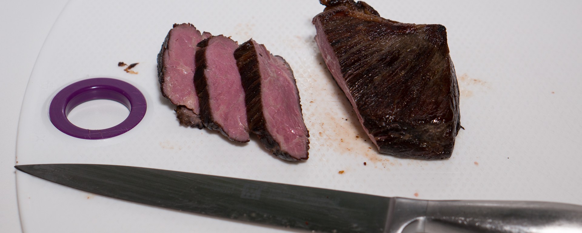 Het vet was gekrompen en opgekruld. Bij het proeven kwam ik erachter dat het bindweefsel tussen het vet en het vlees veel te taai was en na 24 uur op 57 graden nog niet eetbaar, terwijl het vlees dus wel mooi mals was. Ook omdat de vetlaag dwars op de draad van het vlees loopt, lijkt deze vooral aan het vlees te zijn gelaten omdat het er mooi uit ziet en het vlees bij elkaar houdt, maar niet om op te eten.