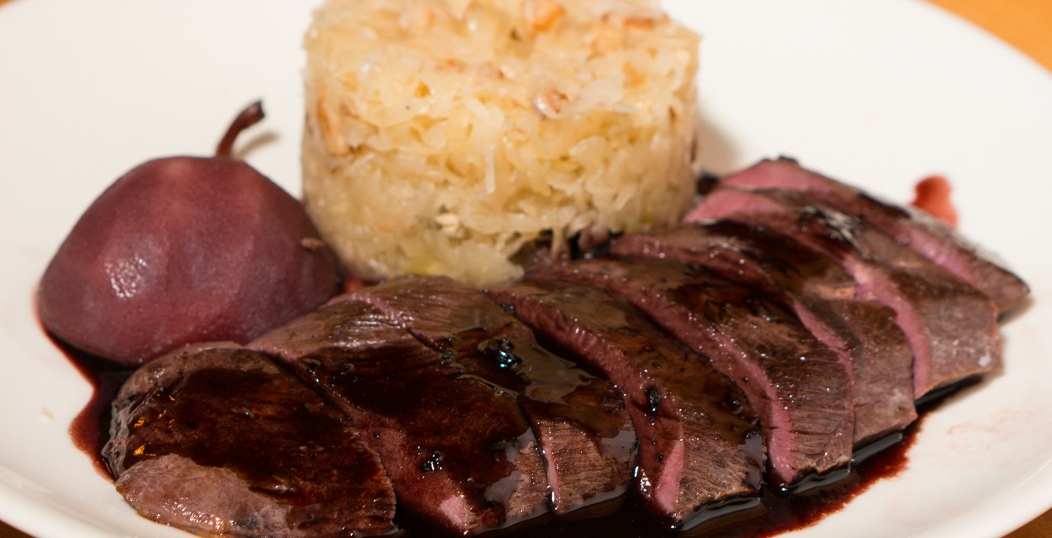 Snijd de ganzenborst in plakjes en serveer deze op voorverwarmde borden met de zuurkool, peer en jus. Verwijder de laurier en jeneverbessen uit de zuurkool voordat je serveert.