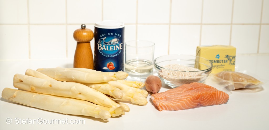 Als je maar één sous vide hebt, gaar je eerst de asperges voordat je begint met de risotto. De zalm doen je dan in de sous vide als je begint met de risotto, want die heeft ongeveer dezelfde tijd nodig. Met twee sous vides doe je de asperges in de sous vide voordat je met de risotto begint, en de zalm op het moment dat je met de risotto begint. Wanneer je de asperges in de sous vide doet, hangt af van je voorkeur voor de zachtheid van de asperges. Houd er daarbij rekening mee dat het maken van de risotto ongeveer 25 minuten duurt vanaf dat je begint met het sjalotje/uitje, en dat je de kopjes er een paar minuten later uithaalt dan de rest. Als je zoals ik de asperges ongeveer 30 minuten wilt garen, doe je de 2 zakken er 5 minuten in voordat je begint met de risotto, en de zak met de kopjes vlak voordat je begint. (De kopjes worden dan een paar minuten korter gegaard, maar dat is juist lekker.)