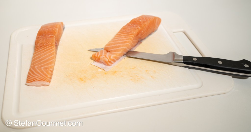 Ook de zalm kun je voorbereiden terwijl de bouillon trekt. Verwijder eerst het vel, als dat er nog aan zit.