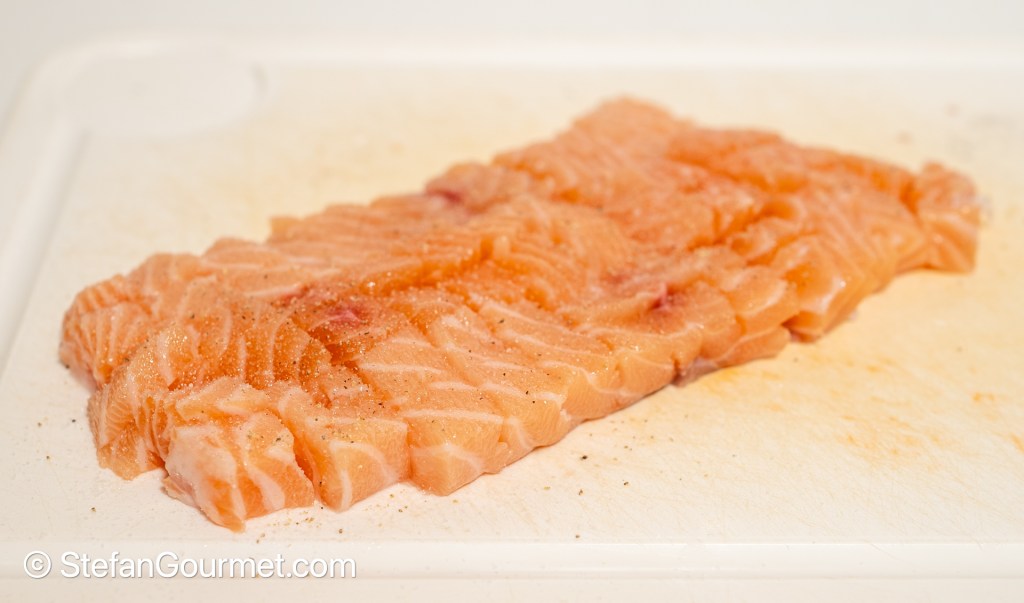 Snijd dan het dikkere gedeelte van de zalmfilet, zodat je twee plakken krijgt van ongeveer gelijke dikte (een kortere en een langere).