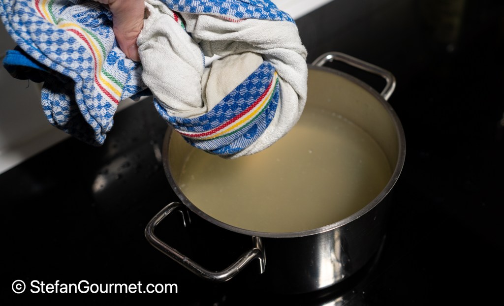 Door de uiteindes van de theedoek in tegengestelde richting de draaien, kun je het meeste vocht eruit wringen. Zo krijg je de meeste smaak in de bouillon.