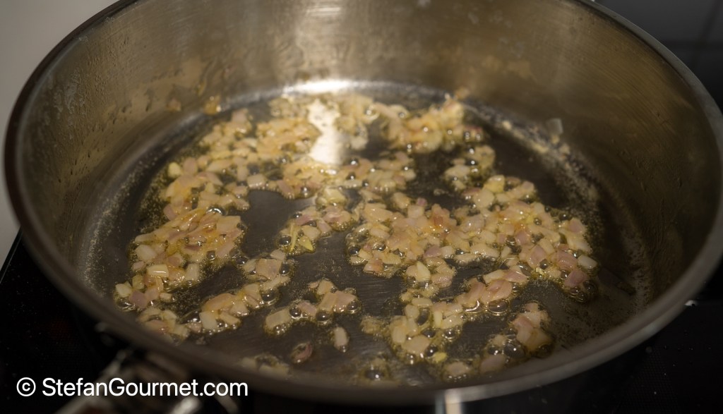 Voeg het fijngehakte sjalotje of uitje toe zodra de boter is gesmolten…