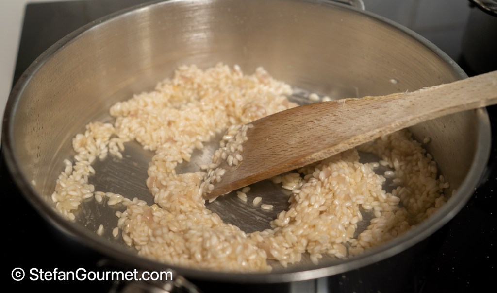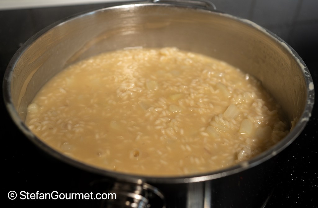 Zorg dat het vuur zo hoog staat dat de bouillon zachtjes blijkt koken. Volgens het officiële recept moet je de hele tijd blijven roeren totdat de bouillon is opgenomen, maar het belangrijkste is om te roeren vanaf het moment dat de bouillon bijna helemaal is opgenomen.