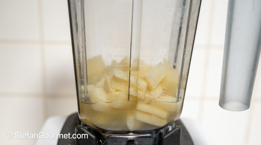 Doe deze asperges in de blender, samen met een flinke lepel van de bouillon en het vocht uit de zak.