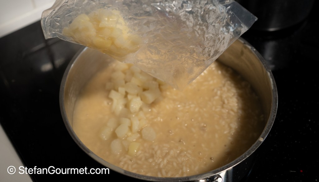 …en giet de inhoud van die zak bij de risotto, zowel de asperges als het vocht.