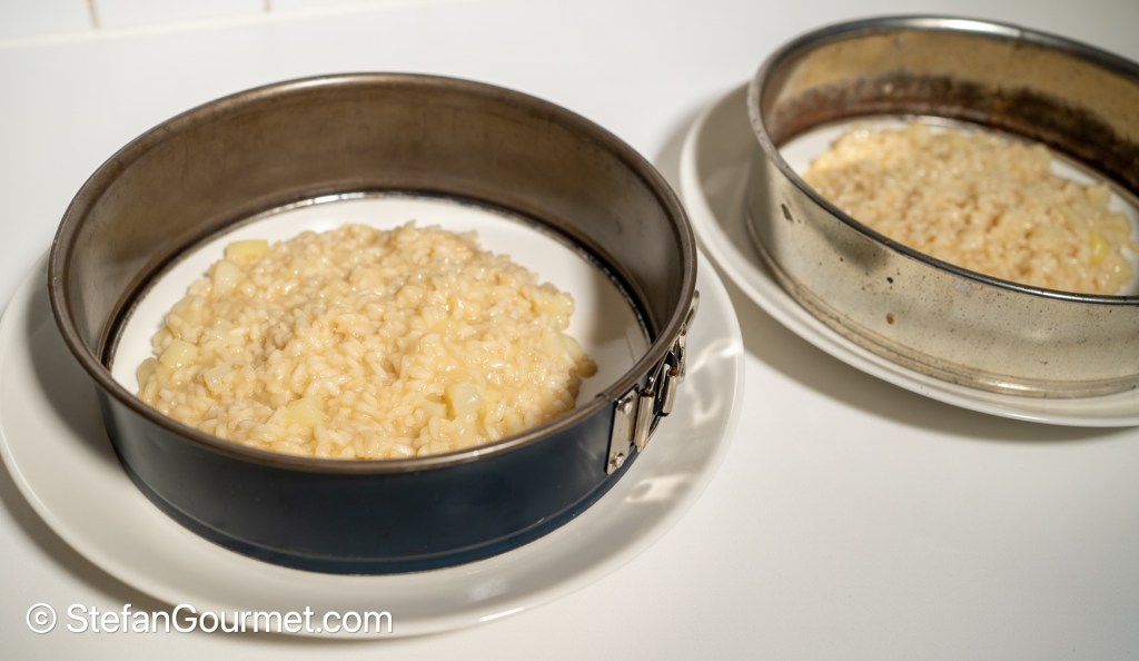 Spreid de risotto daarbij uit met een spatel of lepel tot een laag van gelijke dikte.