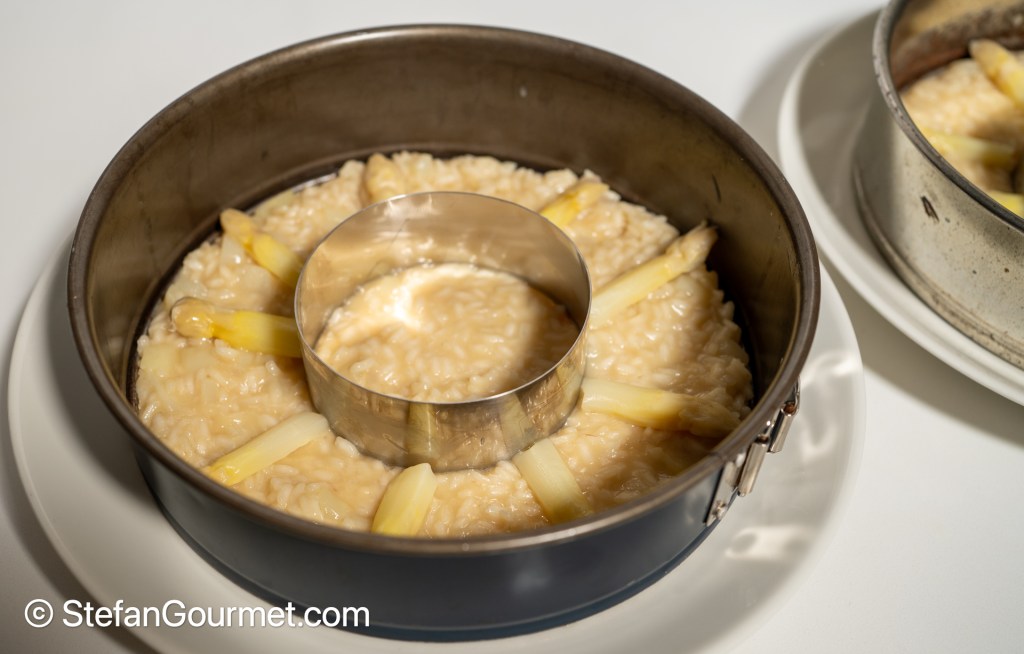 Leg een ring in het midden van de laag risotto, en drapeer de kopjes van de asperges erom heen.