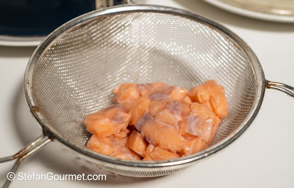 Haal de zalm uit de zak, en giet de zalm af met behulp van een zeef of vergiet.
