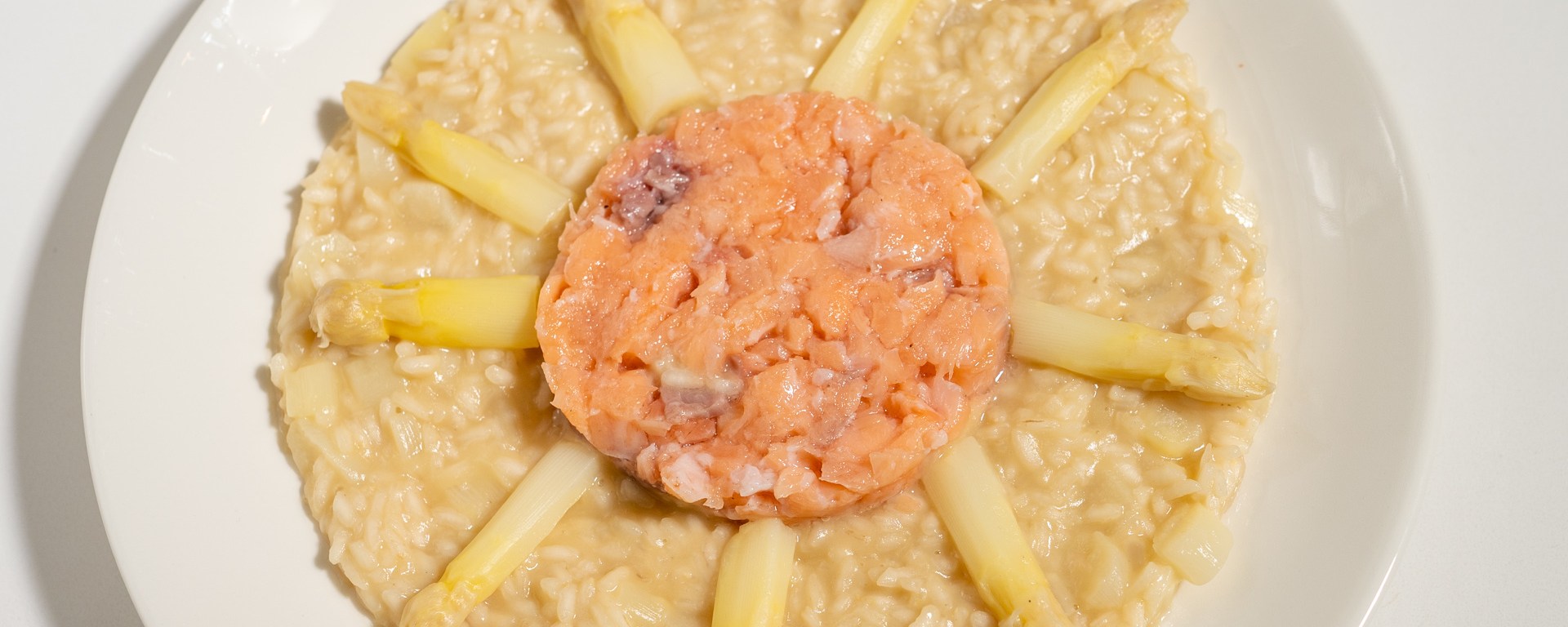 Dit gerecht is een heerlijke combinatie van smaken en texturen. Door sous vide garing hebben de witte asperges nog wat beet en al hun smaak behouden. De sous vide zalm is heerlijk boterig, een effect dat je alleen kunt bereiken door hem precies op 43 graden te garen. De risotto is romig, maar heeft ook nog een lekkere beet. De zalm is lauwwarm, maar door hem op de warme risotto te serveren, koelt hij niet te veel af. Het is wel belangrijk om de borden voor te verwarmen, omdat de risotto in een dunne laag wordt geserveerd en anders te snel af zou koelen.