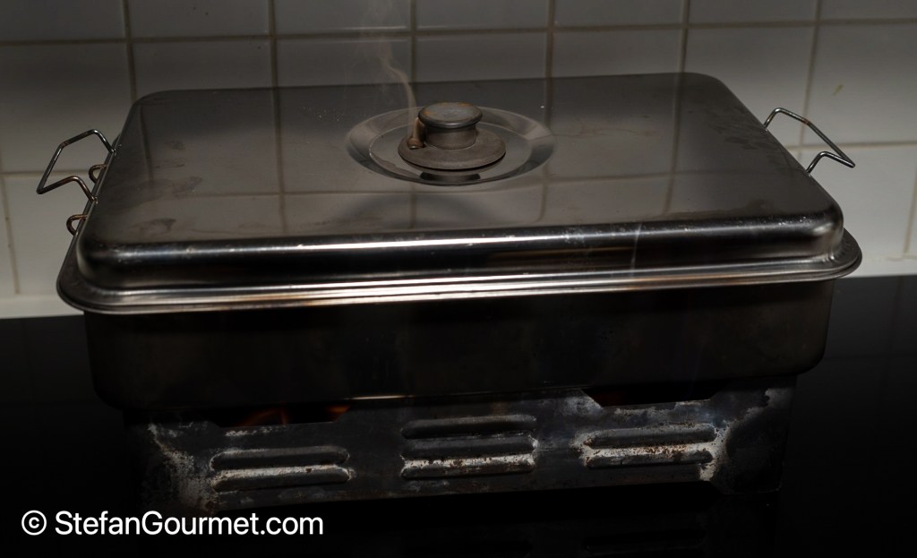 Voor het roken gebruik ik een eenvoudig tafelmodel rookoven dat wordt verwarmd met spiritusbrandertjes of op een gasfornuis.
