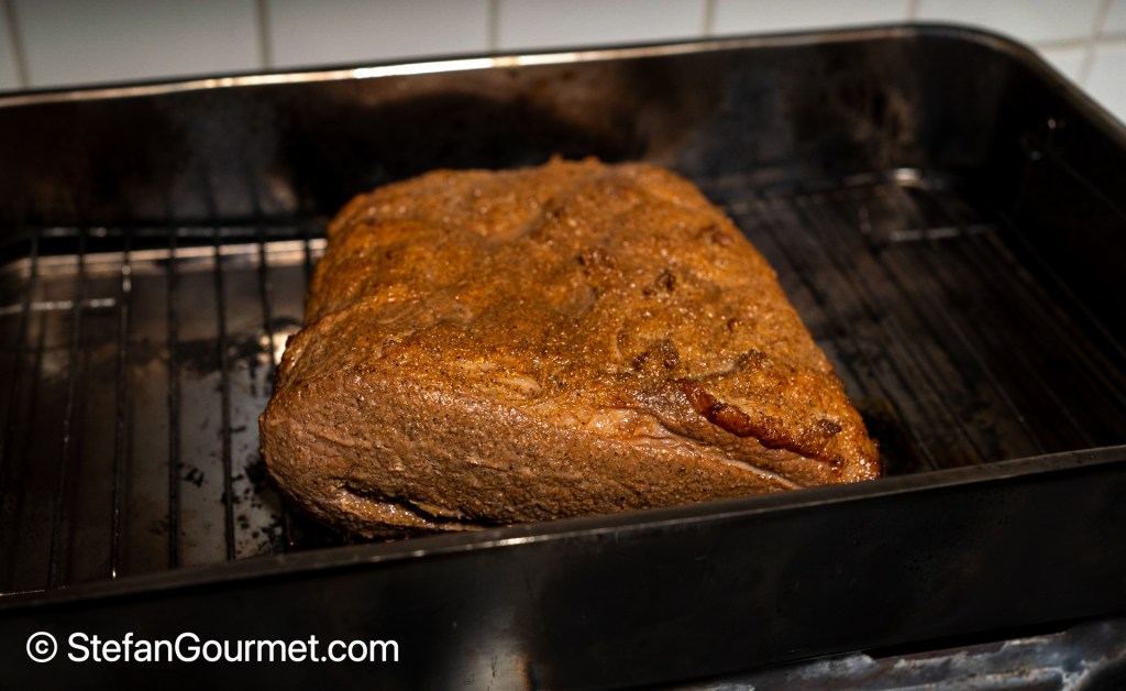 Wrijf het vlees aan alle kanten in met deze dry rub. Laat de dry rub daarna 1-2 dagen intrekken in de koelkast. Ik vind het handig om het vlees daarvoor te vacumeren, maar je kunt het ook op een bord leggen en afdekken met plasticfolie.