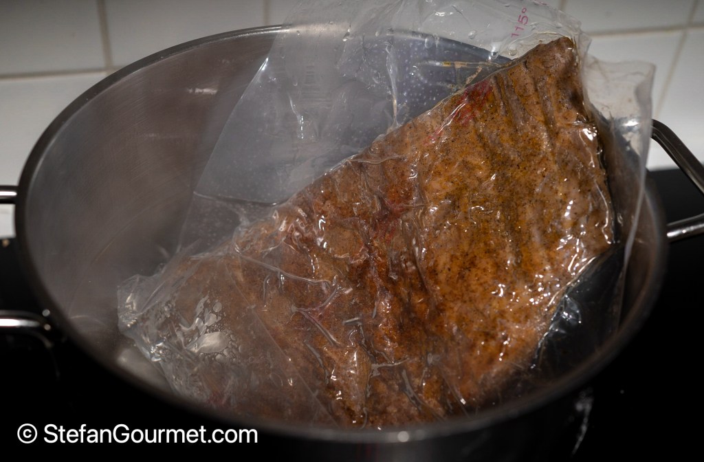 Runderborst is heel geschikt om sous vide te bereiden, omdat het anders best snel uitdroogt. Mijn favoriete garing is 48 uur op 57 graden. Het vlees blijft dan mooi roze en wordt heel mals. Voor dit recept heb ik de runderborst als pastrami bereid door de dry rub en door het vlees kort te roken voordat het de sous vide in gaat (sous vide garing vervangt daarmee het stomen).