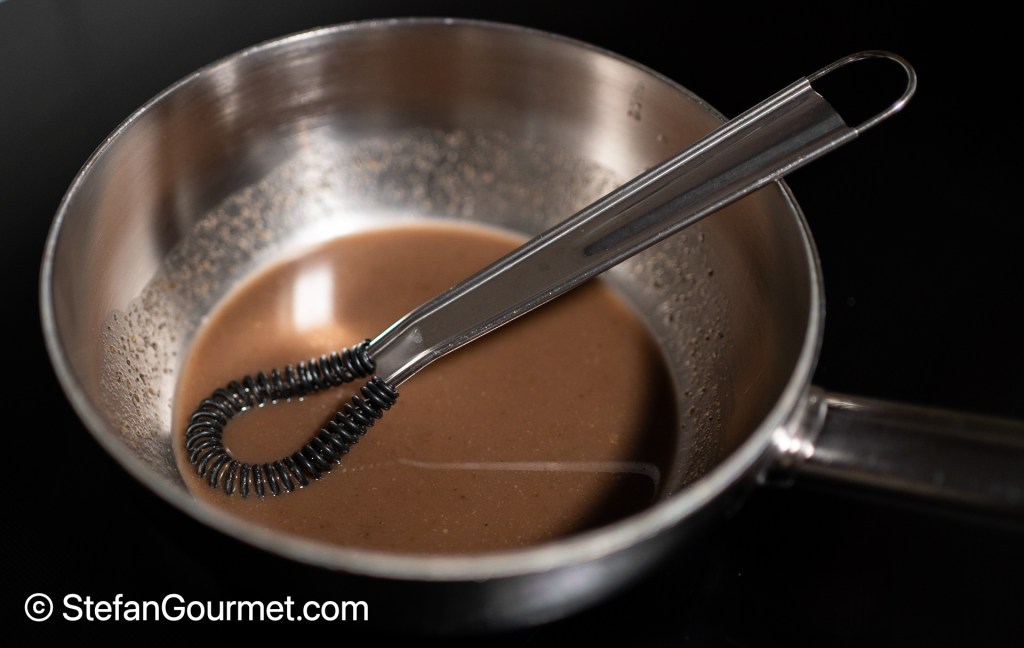 Breng het dan al roerend aan de kook totdat de jus is gebonden.