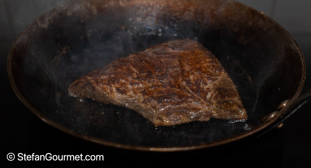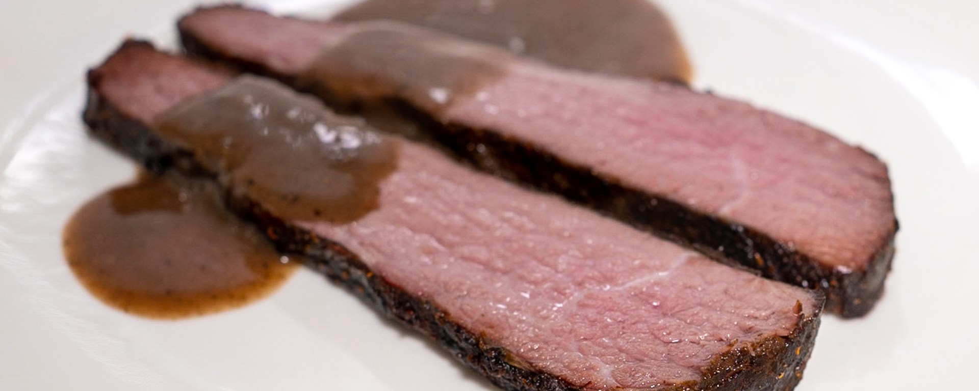 Voor een bruin korstje kun je het vlees nog even kort afbakken op hoog vuur. Dat doe je het lekkerst in gesmolten rundvet. Niet te lang afbakken, want dan droogt het vlees alsnog uit.
