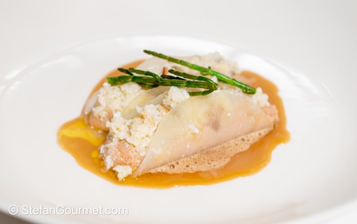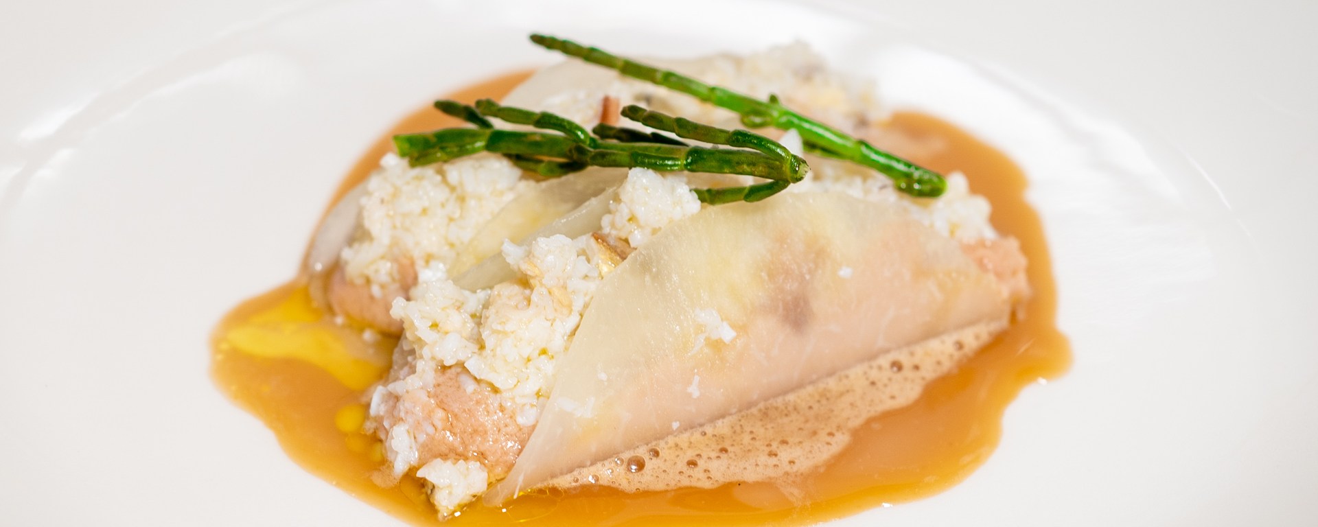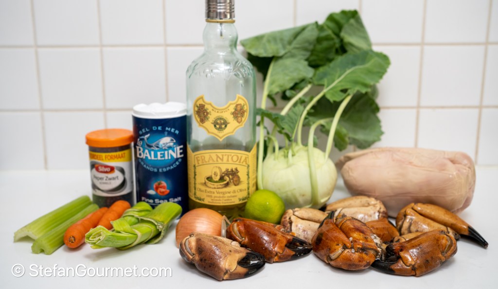 De inspiratie voor dit mooie voorgerechtje kreeg ik bij de Librije, maar dit is geen poging om dat gerecht na te maken. Een ‘taco’ van kohlrabi gevuld met ganzenlever en met limoen aangemaakte krab, geserveerd met de bisque van de krab. De zeekraal is vooral voor de kleur en voorkomt dat de taco openklapt. Het is wat gepruts om de krabschalen goed te verwijderen en de kohlrabi mooi dun te snijden, maar verder is dit een gerechtje dat bijna niet kan mislukken en daarom erg geschikt voor een feestelijk diner. Begin wel op tijd, want de ganzenlever heeft na het sous vide garen tijd nodig om op te stijven.