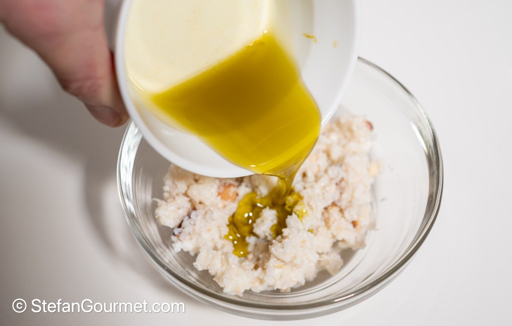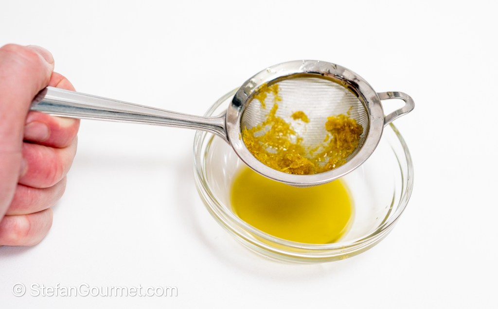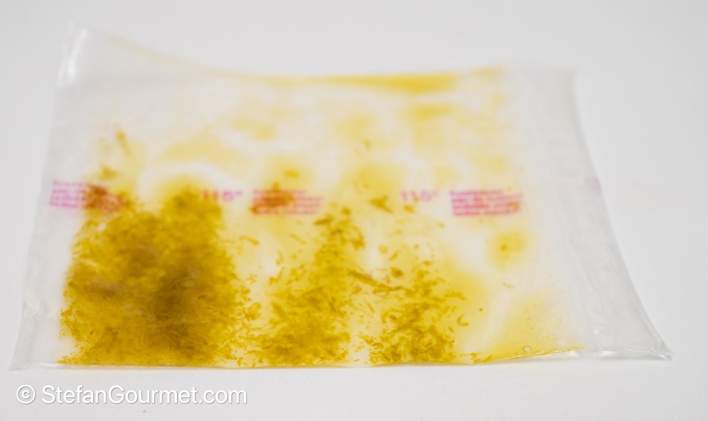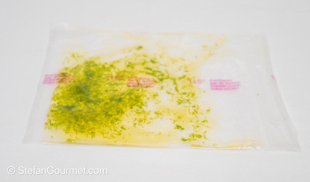 Vacumeer 2 eetlepels goede olijfolie met de limoenrasp. Als je geen vacuümmachine met een kamer hebt, kun je de olie ook in een glazen potje doen of iets dergelijks. Maar een ziploc zakje werkt ook.