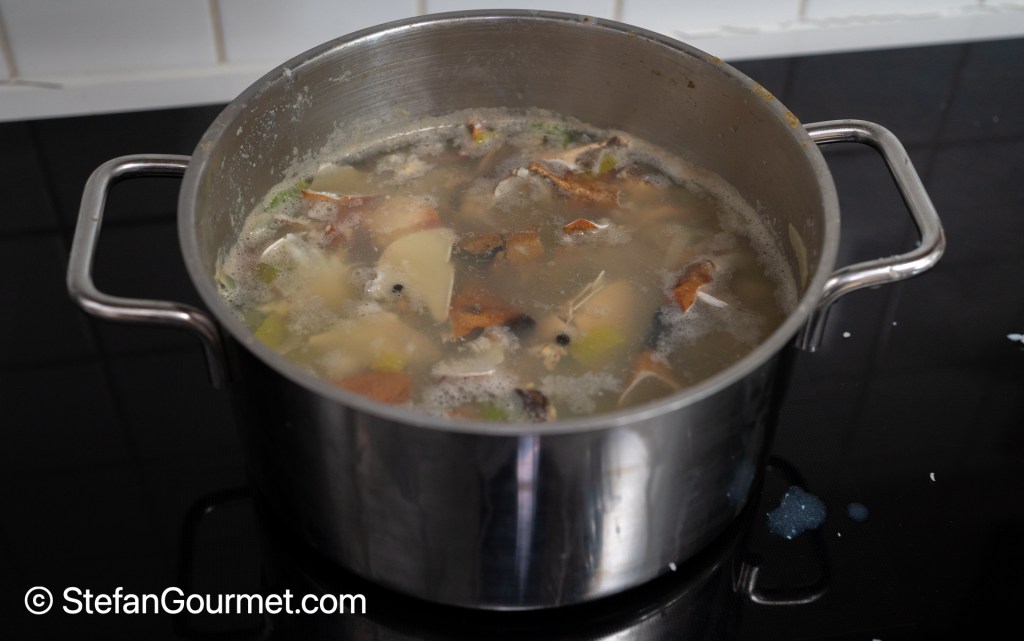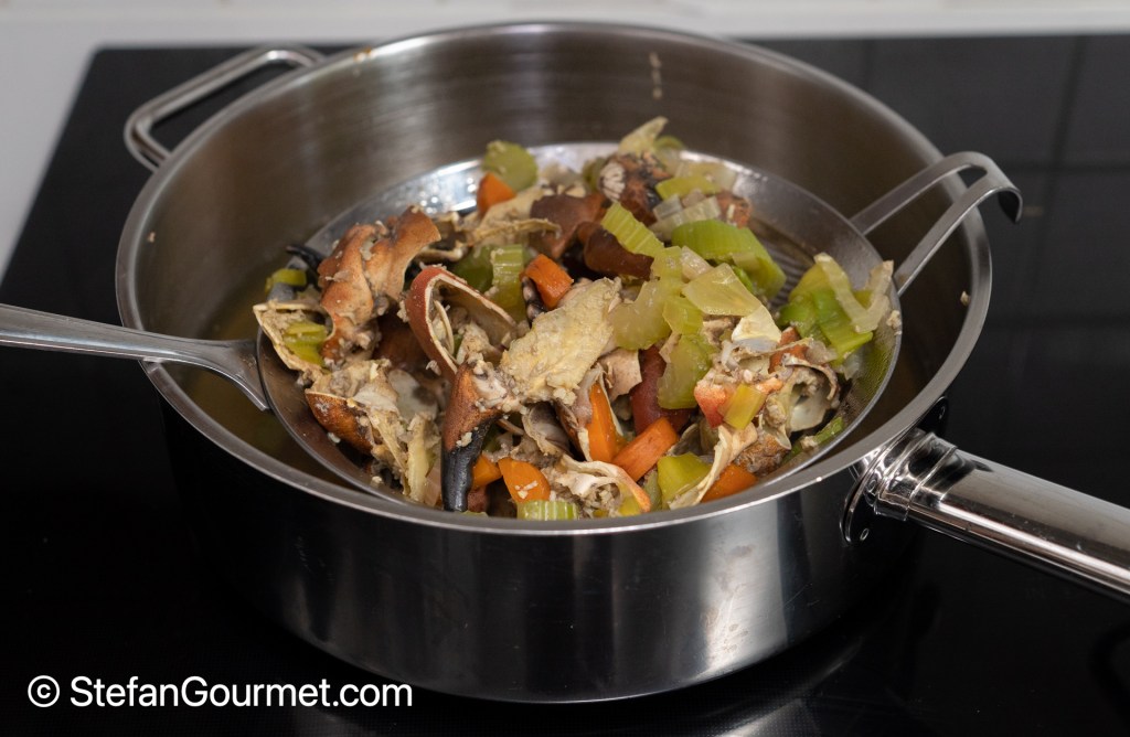 Doe de krabschalen in het bewaarde kookwater, samen met gehakte ui, wortel, bleekselderij, prei en wat zwarte peperkorrels. Breng aan de kook en laat dit een uurtje zachtjes pruttelen om krabbouillon te trekken.