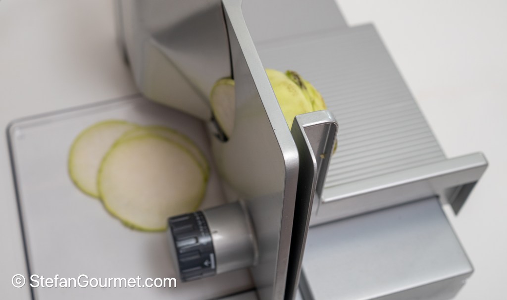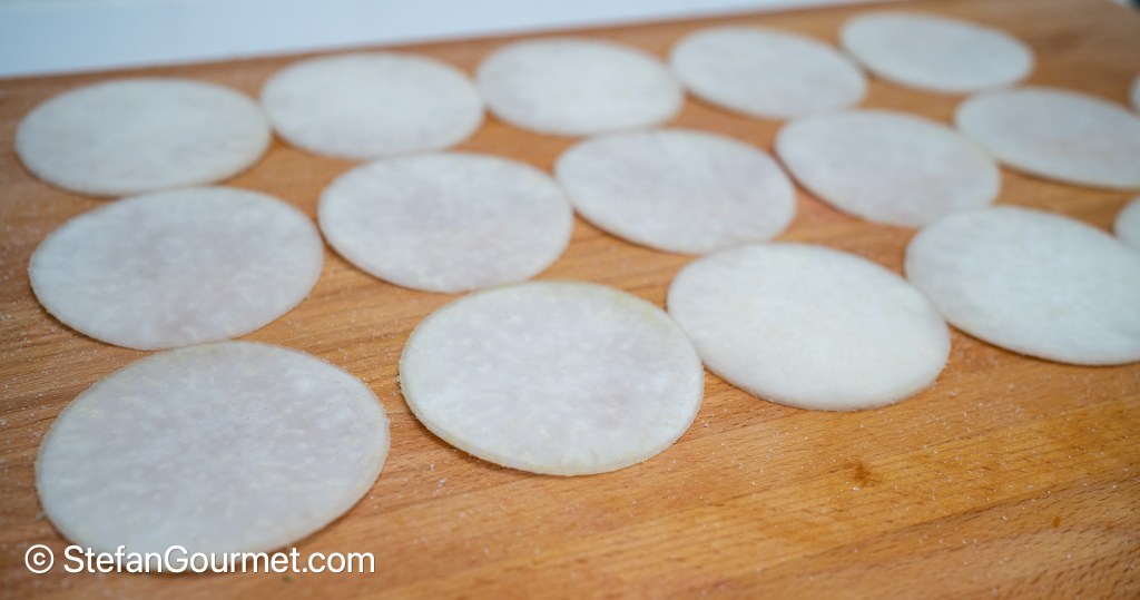 Snijd zeer dunne plakken van de kohlrabi. Ik gebruikte een snijmachine, maar met een scherp koksmes of een brede mandoline moet het ook kunnen.