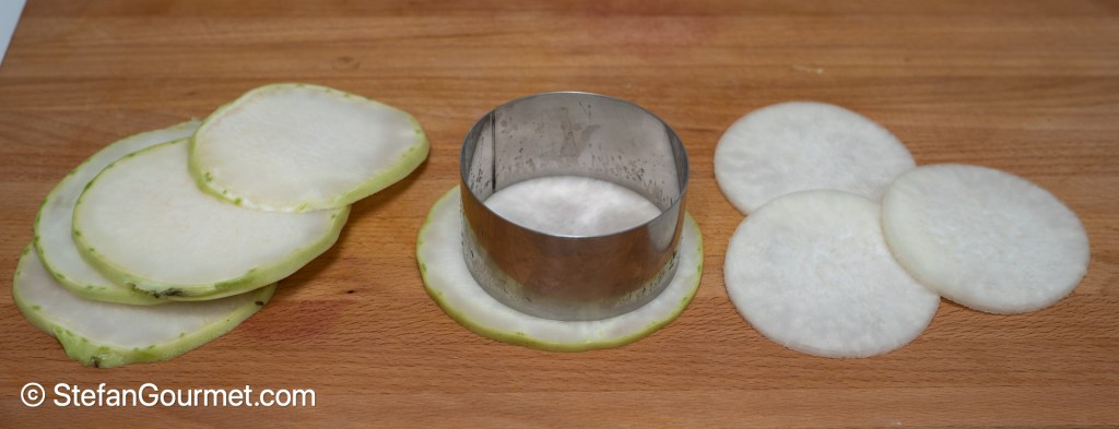 Steek mooie ronde plakjes uit van de kohlrabi met een uitsteekvorm van ongeveer 8 centimeter doorsnede.