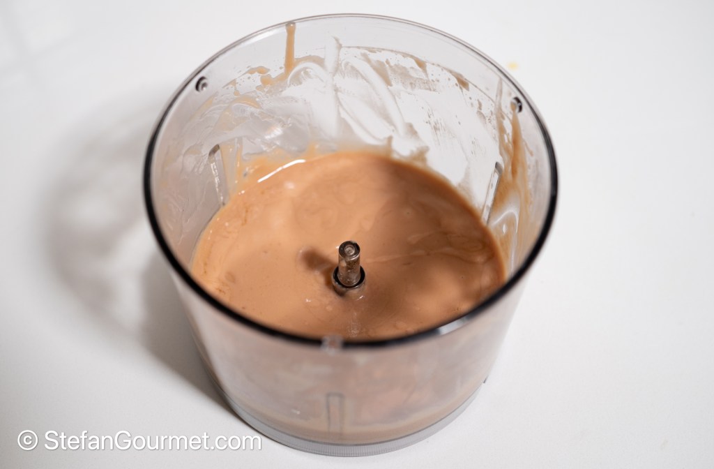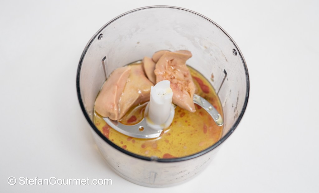 Giet de volledige inhoud van het zakje met ganzenlever in een blender. Zorg dat ook al het vet meekomt, want dat is het belangrijkste.
