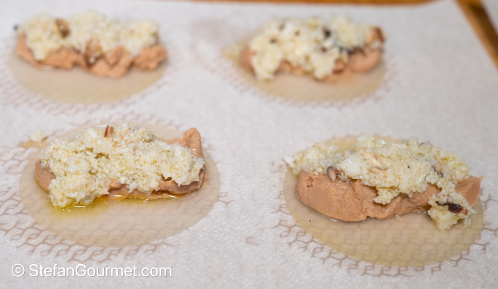 Haal de kohlrabi uit de sous vide en dep de plakjes droog met keukenpapier. Leg op het midden van elk plakje een streep ganzenlever.