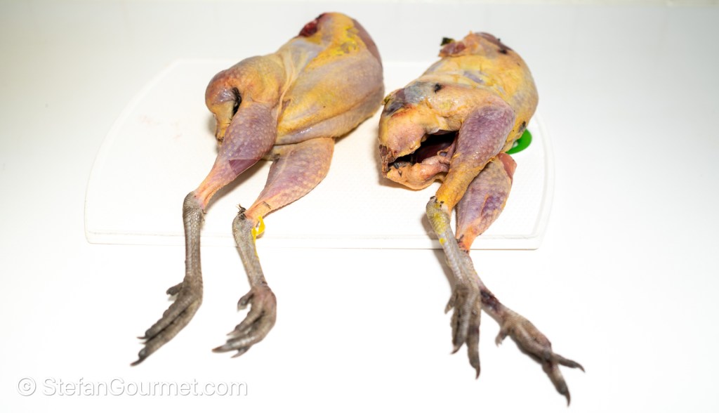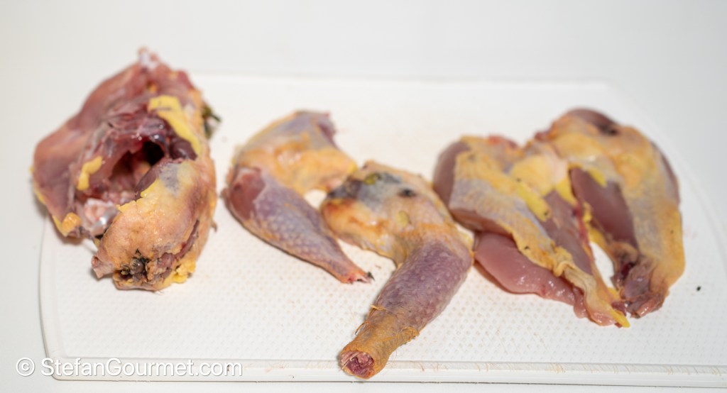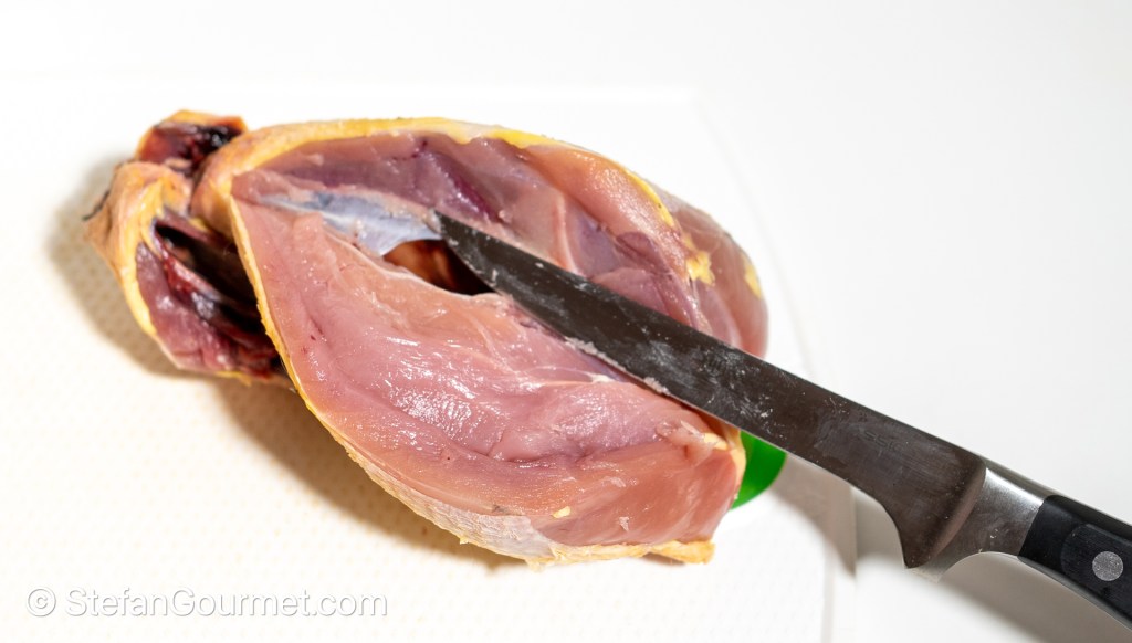 Snij de bouten los van de fazant. Buig daarvoor de poot opzij totdat hij uit de kom gaat en snijd strak langs de romp.