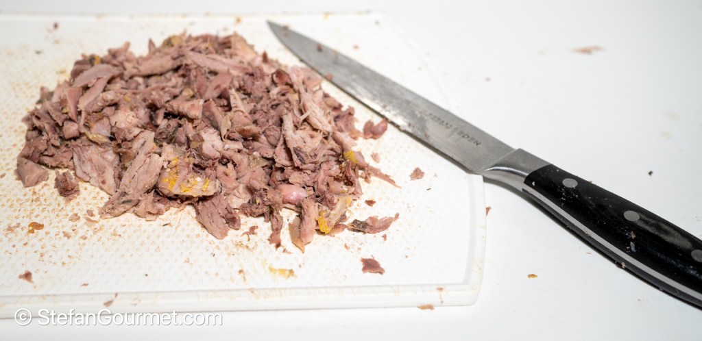 Trek het vlees nu van het bot. Het vlees is zo gaar dat je geen mes nodig hebt. Let goed op dat je alle ‘graten’ ook uit het vlees haalt. Fazant heeft in de bout zeer dunne botjes die eruit zien al graten.