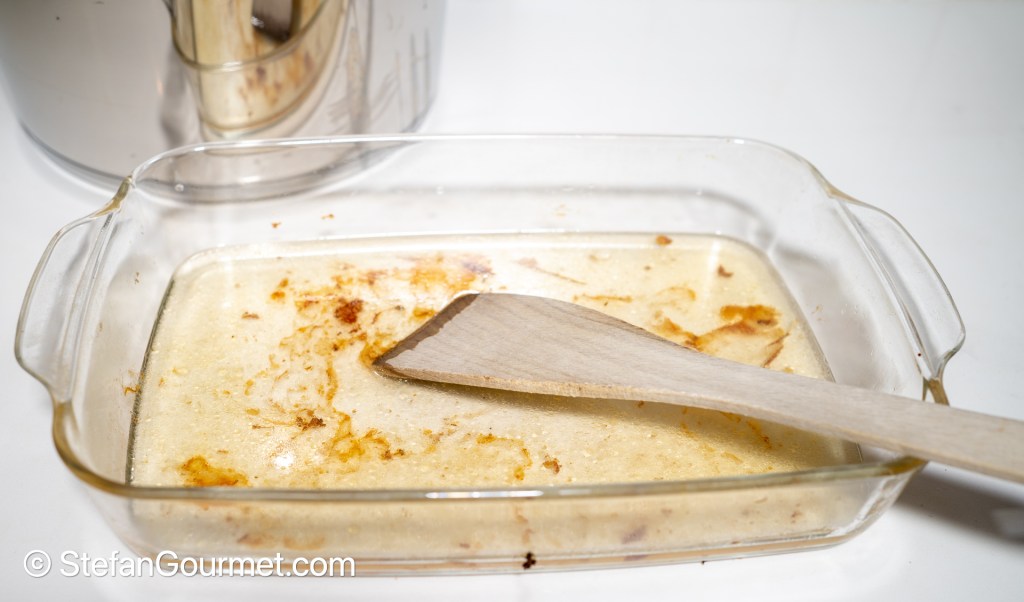 Doe de gebruinde botten en karkassen in een pan. Als je een snelkookpan hebt, kun je daarmee de bouillon in de helft van de tijd en met meer smaak trekken. Giet warm water in de ovenschaal en schraap met een houten spatel om alle aanbaksels (= smaak) ook in de jus te krijgen.