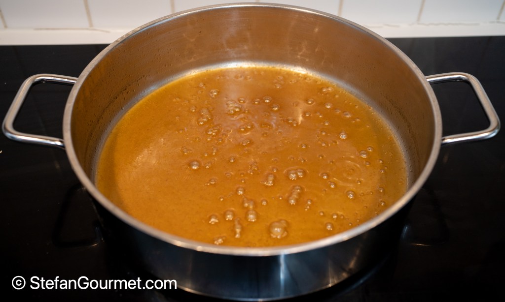 Doe de deksel op de pan, breng het aan de kook, en laat de bouillon daarna drie uur zachtjes trekken. Met een snelkookpan kan het in anderhalf uur.