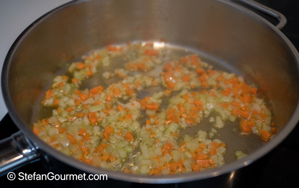 Verhit twee eetlepels olijfolie in een hapjespan en fruit daarin zachtjes 25 gram zeer fijn gehakte ui, 25 gram zeer fijn gehakte wortel en 25 gram zeer fijn gehakte bleekselderij.