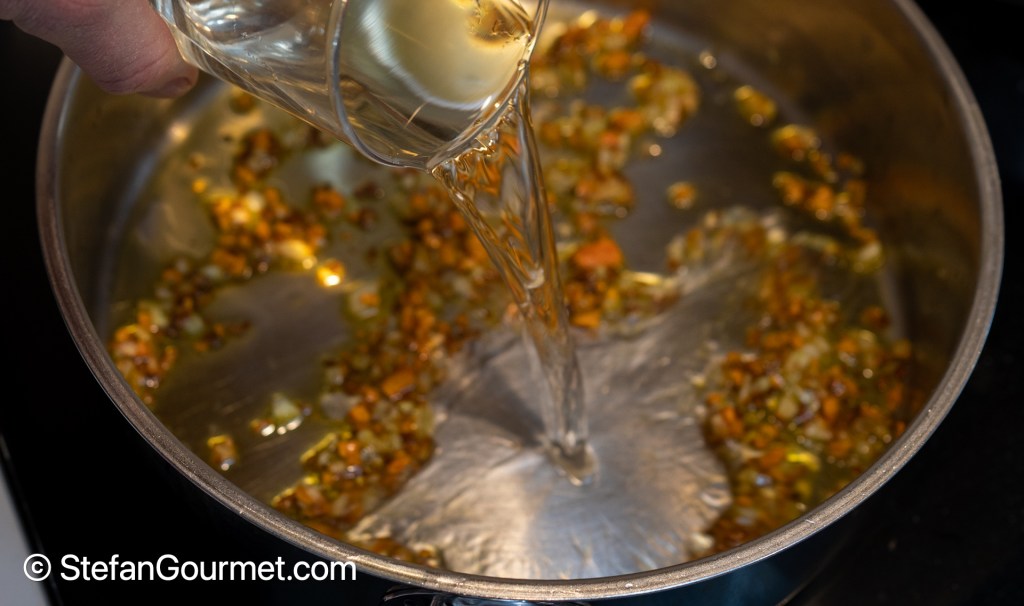 Blus dit af met 80 ml droge witte wijn zodra de groente goudbruin begint te worden. Laat de wijn tot de helft inkoken en voeg daarna de helft van de ingekookte fazantbouillon toe.