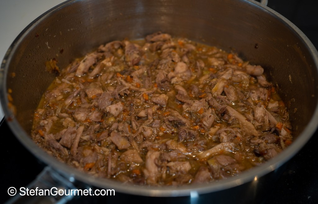 Roer het vlees door de jus, breng dit tot tegen de kook aan en zet daarna het vuur helemaal uit, om te voorkomen dat het vlees alsnog uitdroogt. Proef of het nodig is om zout en/of versgemalen zwarte peper toe te voegen. De sugo di fagiano is nu klaar.