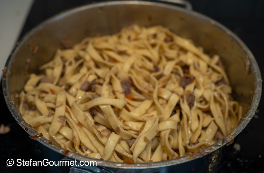 Kook de verse pasta al dente in gezouten water. Giet deze af, en doe de pasta bij de sugo.