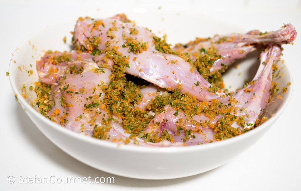 Bestrooi de konijnenbouten aan alle kanten met zout en versgemalen zwarte peper. Doe ze daarna in een kom met het groente- en kruidenmengsel, en verdeel het mengsel over de bouten.