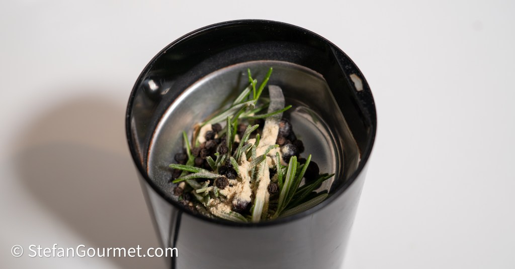 Hak de peperkorrels, jeneverbessen en rozemarijn zeer fijn met een koksmes, vijzel of koffiemolen. Omdat mijn knoflookpoeder wat klonterig was, heb ik dat ook meegemalen in de koffiemolen.