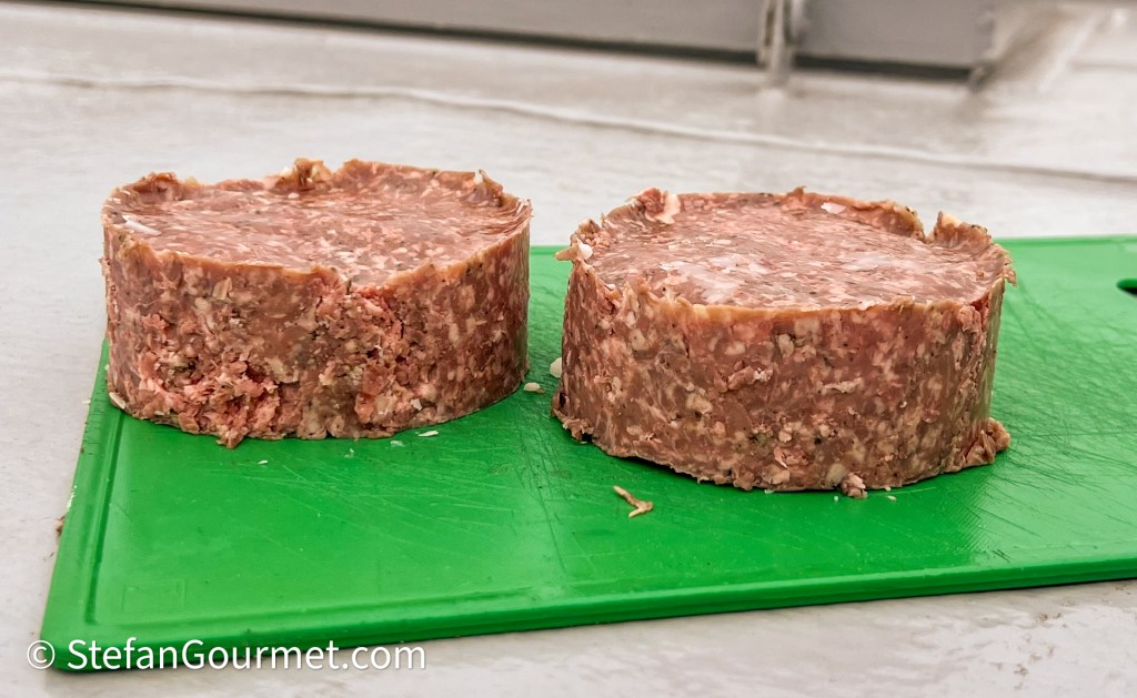 Vorm 2 hertenburgers van het gekruide gehakt. Hiervoor gebruikte ik twee roestvrijstalen ringen van 10 cm diameter en 4 cm hoog. Door de ringen behouden de burgers hun vorm bij het vacumeren.