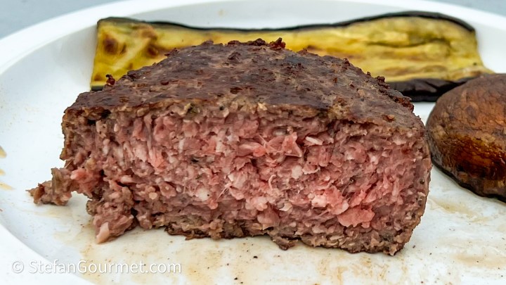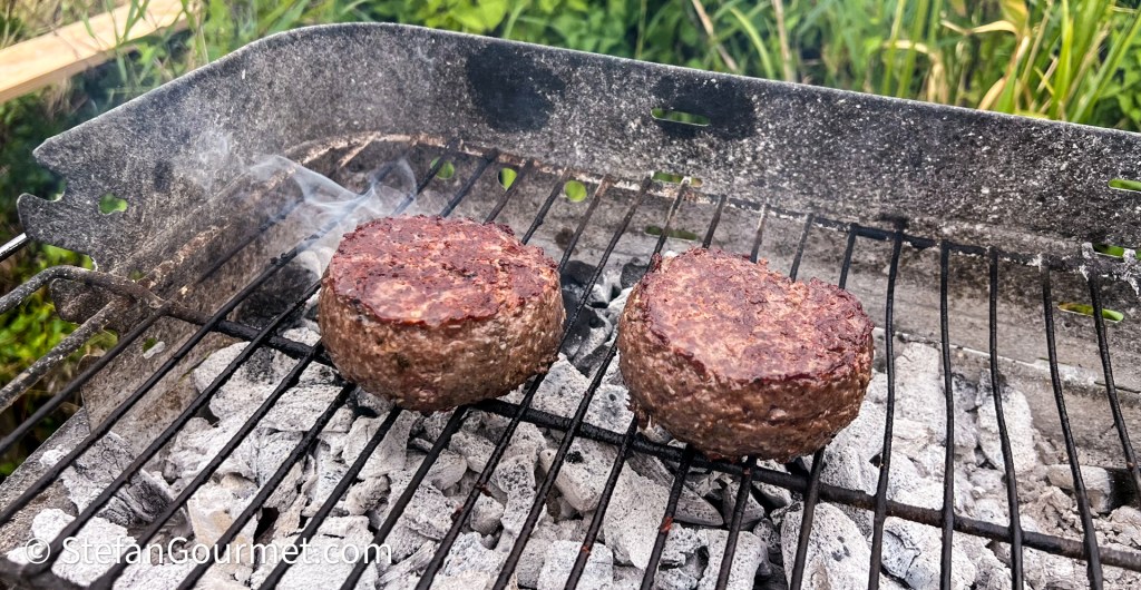 Laat de burgers voor het bakken op kamertemperatuur komen. Bak de hamburgers boven zeer heet houtskoolvuur totdat ze mooi bruin zijn aan beide zijden. Keer de burgers een paar keer om een goede verhouding te krijgen tussen bruin van buiten en warm van binnen (als je heel vaak keert worden ze minder bruin van buiten en meer warm/gaar van binnen, als je ze maar 1x keert worden ze bruiner en minder warm/gaar van binnen). Ik heb ze 2 maal ongeveer 2 minuten per kant laten garen (in totaal dus ongeveer 8 minuten). De benodigde tijd hangt af van hoe heet je BBQ is. Omdat de burgers al gaar zijn van binnen, hoef je je daar geen zorgen over te maken. Wat mij betreft liever iets minder warm van binnen en mooi rood, dan dat hij er te lang op ligt en doorbakken/grijs wordt.