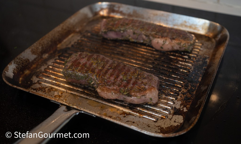 Grill het vlees op de zeer hete grillpan op hoog vuur, 1 minuut per kant. Als je geen mooie streepjes krijgt, heb je het vlees niet voldoende droog gemaakt, of was je grillpan niet heet genoeg.