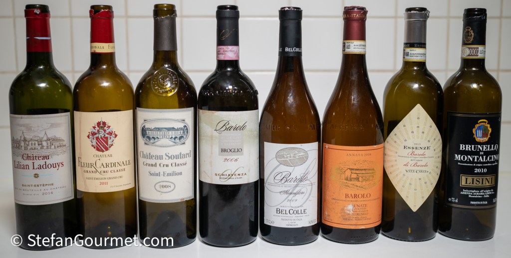 Ik heb dit gerecht uitgeprobeerd met de 8 wijnen die hierboven staan afgebeeld. De beste combinaties waren de Barolo Broglio 2006, de Barolo Bel Colle Monvigliero 2009 en de Brunello Lisini 2010. Ook mooi erbij waren de Barolo Marengo Brunate 2008, de Chateau Soutard Saint-Émilion 2008, en Chateau Fleur Cardinale Saint-Émilion 2011. De Barolo Vite Colte Essenze 2013 en Chateau Lilian Ladouys Saint-Estèphe 2016 waren veelbelovend, maar nog te jong toen ik de wijnen proefde (eind 2022).