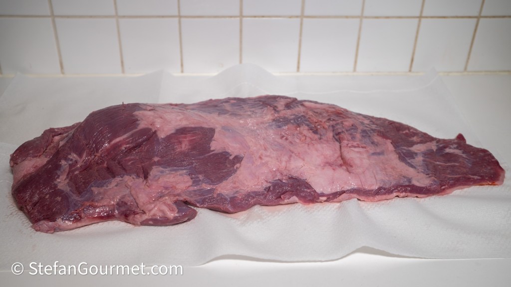 Een runderborst bestaat uit twee delen die op elkaar zitten met een verschillende richting van de vezels in het vlees en met een vetlaag ertussen. Om het vlees mooi dwars op de draad te kunnen snijden en om te voorkomen dat er een dikke vetlaag door de plakjes vlees heenloopt, moeten deze twee delen van elkaar worden gescheiden. Dit kun je aan de slager vragen, of zelf doen. Op de foto kun je zien dat de vezels in een verschillende richting lopen. Het van elkaar halen dor je door de vetlaag op te zoeken en die ertussenuit te snijden.