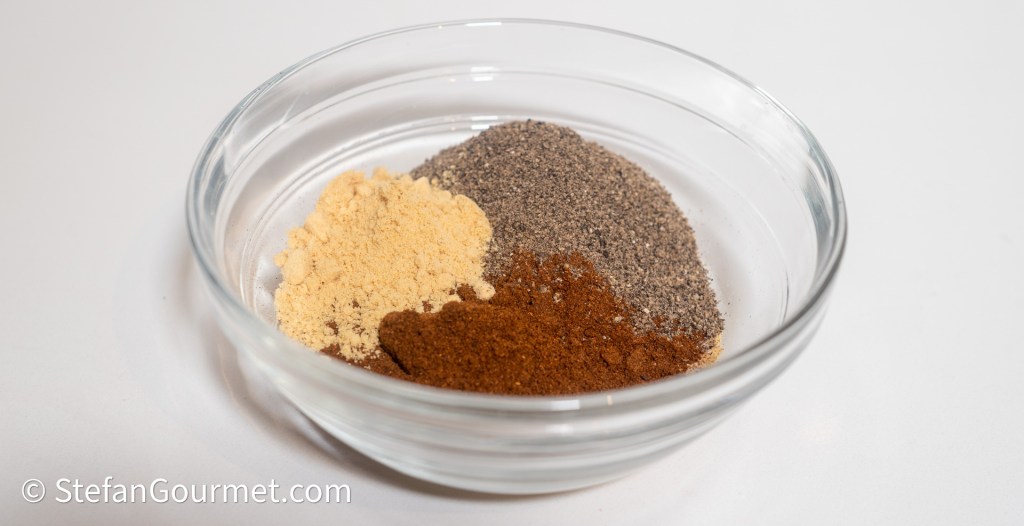 Maak de dry rub door 2 eetlepels zwarte peper, 1 eetlepel uipoeder, 1 eetlepel knoflookpoeder, 2 eetlepels Amerikaanse chilipoeder, 1 theelepel chipotle poeder en 2 theelepels mosterdpoeder in een kommetje te doen…