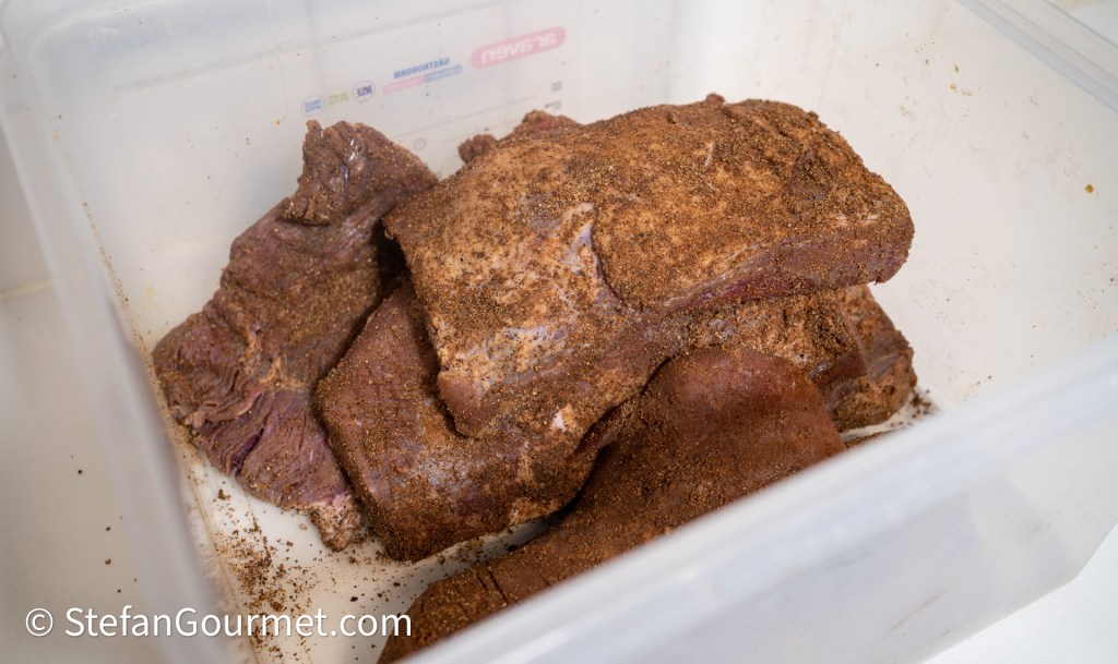 Wrijf de gerookte stukken vlees aan alle kanten in met de dry rub. Dit gaat het beste in een grote bak of (zeer) grote schaal.