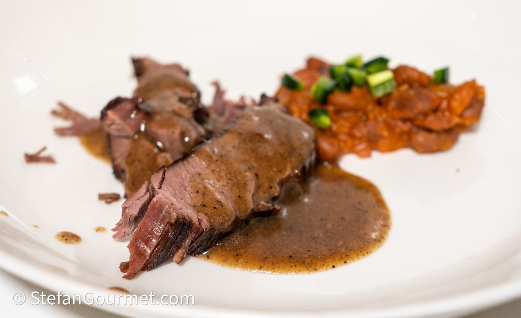 Dit is lekker met een soepele rode wijn die wat rokerigheid heeft, zachte tannines en niet te hoge zuren, maar wel redelijk vol van smaak. Bij wijn-spijsavonden hebben we de brisket met in totala 7 verschillende wijnen geprobeerd en die pasten allemaal goed tot zeer goed. De beste waren een Etna Rosso uit Sicilië een een Pinot Nero Vigna Cantanghel uit Trentino (Italië). De houtgerijpte topwijn van Barbera uit Piemonte, Bricco dell’Uccellone van Braida, was ook heel goed erbij, maar deze wijn is eigenlijk te mooi voor bij dit gerecht. De Schioppettino uit Friuli was ook heel goed. De Ribeca van Perricone uit Sicilië was goed, maar iets te zwaar voor het gerecht. De Spätburgunder uit Duitsland en de Pinot Nero Riserva uit Alto Adige waren juist iets te licht.