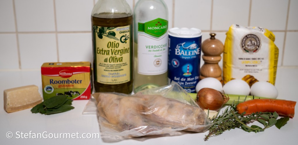 Voor deze ravioli was het mijn doel om de smaak van (tam) konijn duidelijk naar voren te laten komen. Vanwege de delicate smaak betekende dat ik geen andere prominente ingrediënten heb gebruikt en dat ik de maximale smaak uit het konijn heb geperst door bouillon te trekken van de botjes, die bouillon in te koken en de geconcentreerde bouillon tot te voegen aan de vulling.